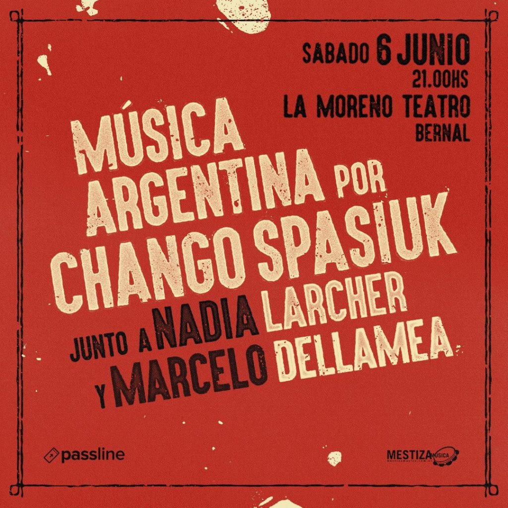 El sábado 6 de junio, Chango Spasiuk (acordeón), Nadia Larcher (voz) y Marcelo Dellamea (guitarra) presentan Música Argentina en el teatro de La Moreno de Bernal.